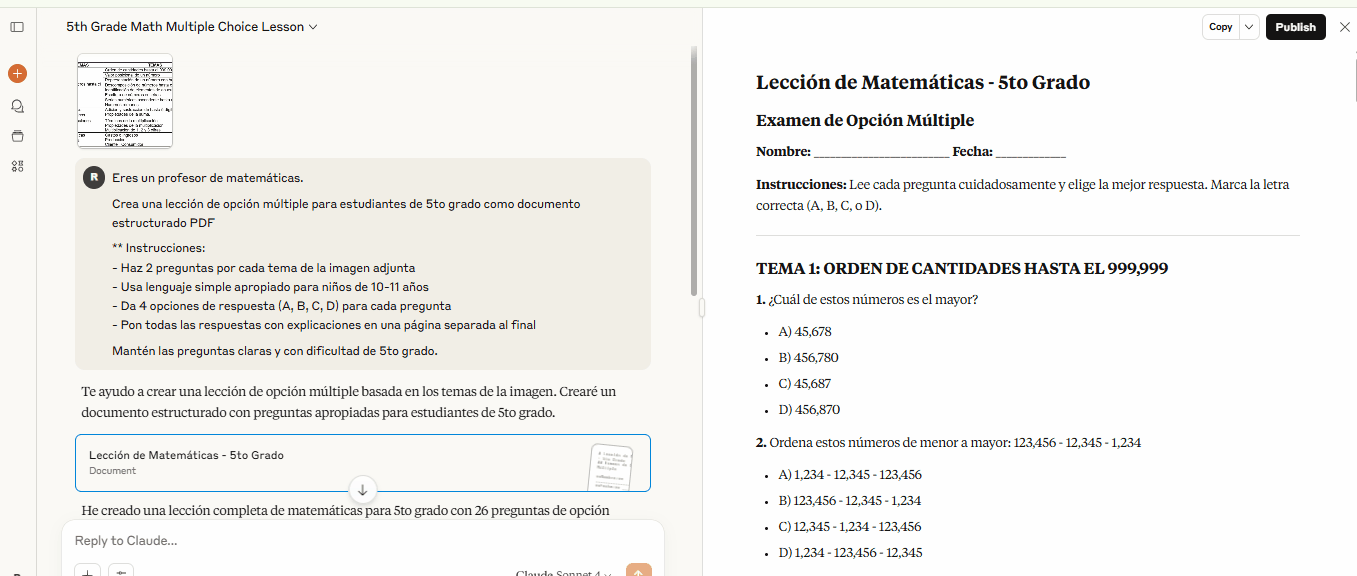 De esta manera, Claude usará la imagen como referencia de los temas que deberá considerar para crear una lección de matemáticas que cubra exactamente lo que mi hijo necesita evaluar 😄.