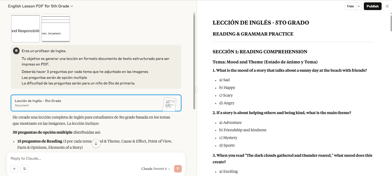 Este mismo enfoque funciona en todas las materias: Historia, Ciencias, Literatura. Simplemente proporciona materiales relevantes (documentos, imágenes o temas), instrucciones claras y deja que la IA cree contenido personalizado.