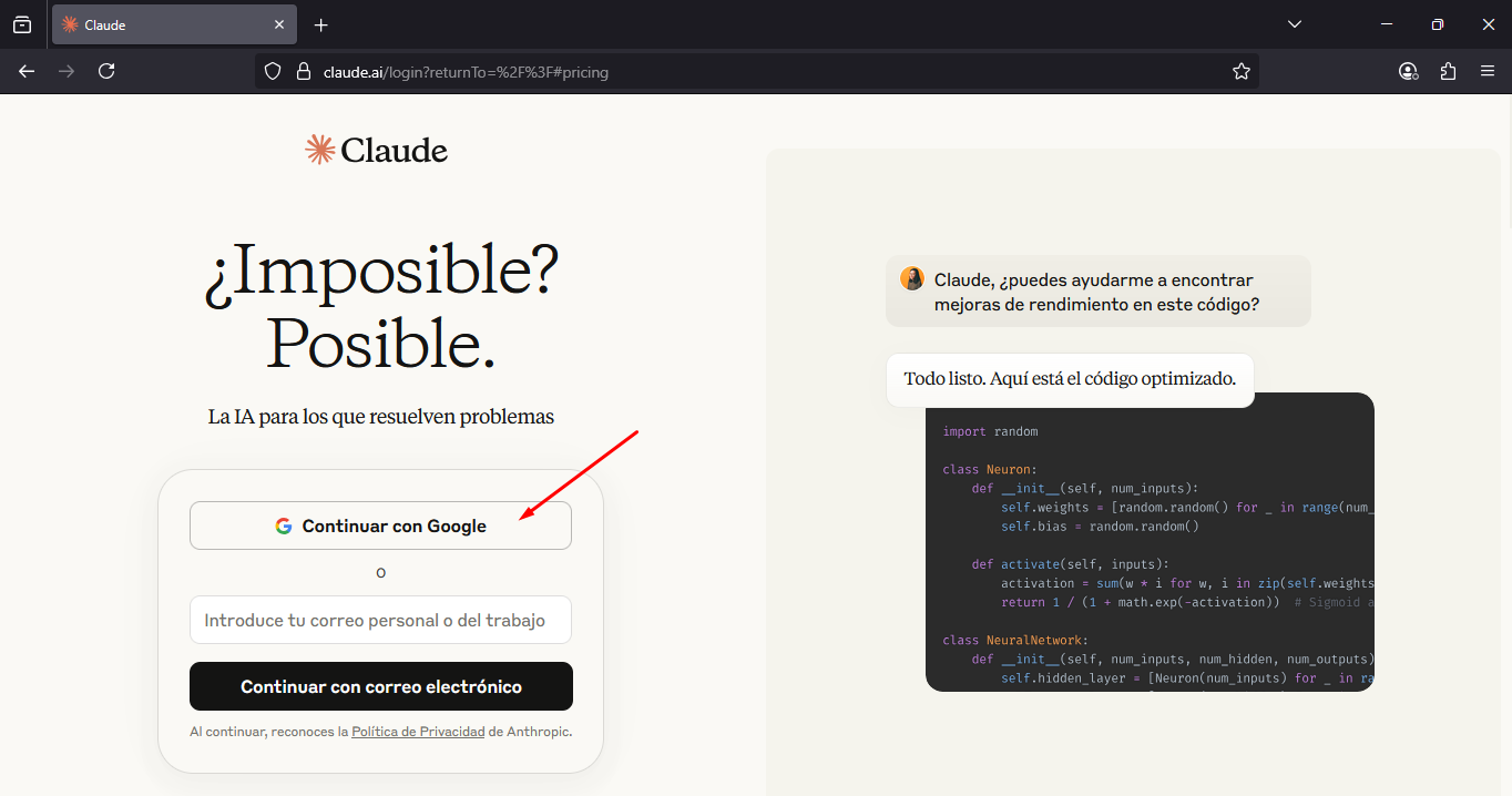 - Desde un navegador ingresa a la página de Claude e inicia sesión preferible usando tu cuenta de Google por mayor comodidad (puedes usar también cualquier otro correo electrónico).