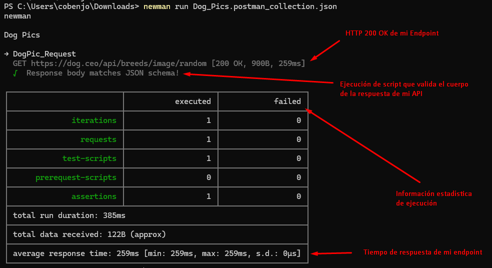 newman run Dog_Pics.postman_collection.jsonPara efectos de prueba, mi archivo JSON exportado contiene las instrucciones para llamar a una API pública que responde aleatoriamente con enlaces de fotos de perros 😄. Además, contiene código Javascript integrado que validará la estructura de la respuesta del API y en caso de discrepancias, el script integrado arrojará una excepción.