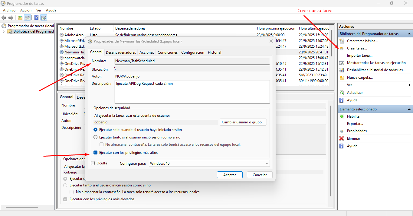 - Abrir el Programador de tareas de Windows -> Biblioteca del Programador de tareas -> Crear tarea