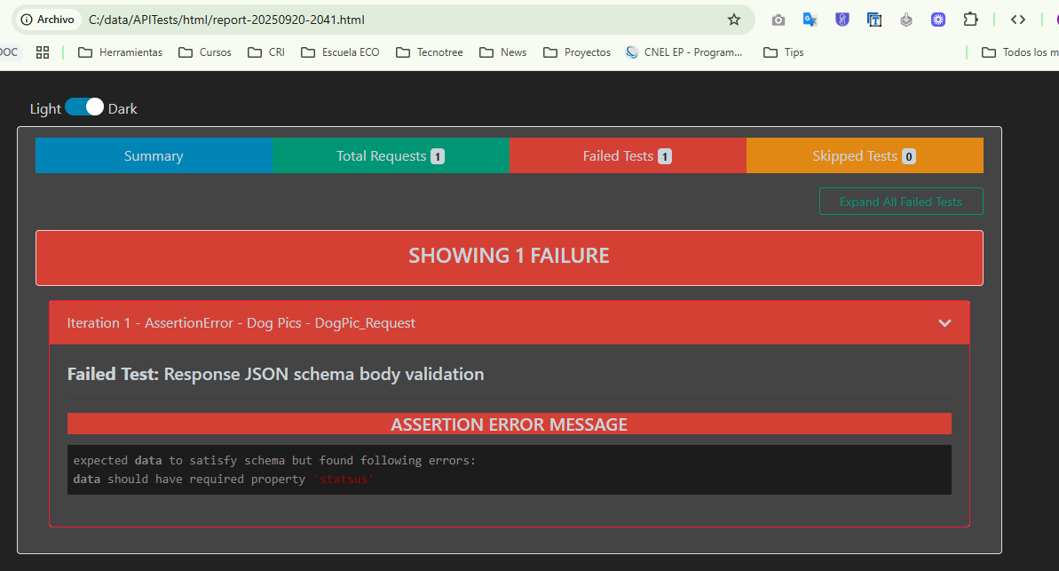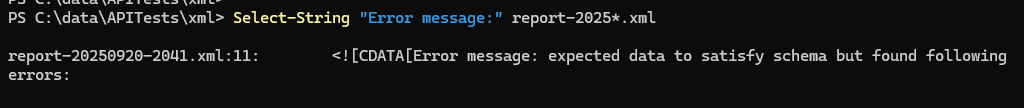 Por ejemplo, mediante línea de comandos, podemos buscar rápidamente en cuáles de estos reportes existió errores en la llamada o validación del API, y así localizar de inmediato el reporte HTML correspondiente para visualizar el detalle completo de manera más clara y detallada.